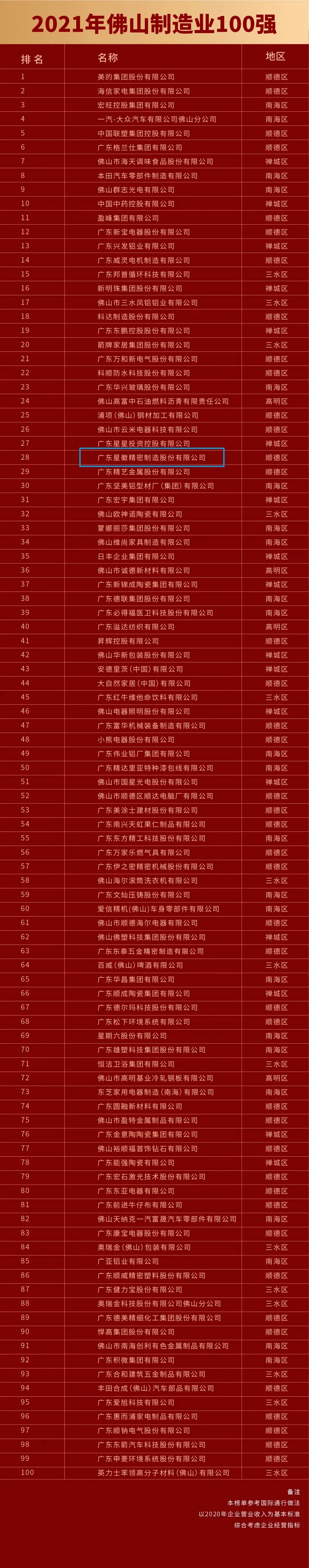 2021年11月20日,由佛山市企業(yè)聯(lián)合會、佛山市企業(yè)家協(xié)會主辦的2021年佛山市企業(yè)家活動日暨佛山企業(yè)100強、制造業(yè)100強企業(yè)發(fā)布會順利舉行。會上發(fā)布了佛山雙百強榜單,憑借強勁的綜合實力和品牌影響力,星徽精密榮登“2021年佛山企業(yè)100強“第56名、“2021年佛山制造業(yè)100強”第28名,在家居五金企業(yè)中排名位列第一。