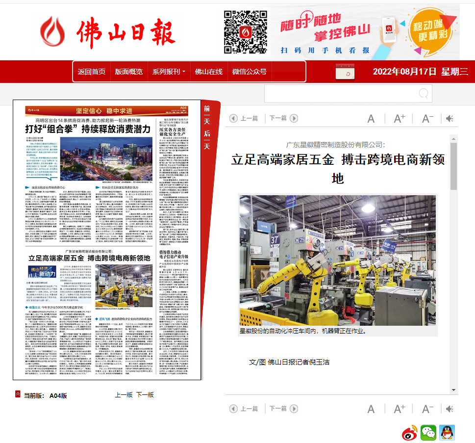 提到中國高端家居五金品牌,廣東星徽精密制造股份有限公司(下稱“星徽股份”)一定榜上有名。這個扎根佛山順德28年的本土企業(yè),依靠創(chuàng)新與品質(zhì),從鄉(xiāng)鎮(zhèn)田野走到了資本市場,成為“家居五金行業(yè)第一股”。 2019年,星徽股份成功收購知名跨境電商企業(yè)深圳市澤寶電子商務(wù)股份有限公司(現(xiàn)更名為深圳市澤寶創(chuàng)新技術(shù)有限公司,下稱“澤寶技術(shù)”),形成了五金精密制造+消費電子研發(fā)銷售雙主業(yè)。 星徽股份副總經(jīng)理蔡文華在接待“尋找佛山經(jīng)濟(jì)新動力”調(diào)研團(tuán)隊時透露,公司高度重視數(shù)字化智能化轉(zhuǎn)型,目前正在按照百億規(guī)?;I備建立新的智能工廠。消費電子方面,澤寶技術(shù)也從去年的亞馬遜封號事件中逐漸走出來,建立起新的銷售渠道,并建立了國內(nèi)電商事業(yè)部,專攻國內(nèi)市場。 做強主業(yè) 2022年投5000萬元推進(jìn)數(shù)字化 進(jìn)入星徽股份的自動化沖壓車間,只見到少量工人在上下料,更吸引人眼球的是排列整齊的各類自動化設(shè)備和機器臂。它們幾臺組成一個“團(tuán)隊”,在同一條生產(chǎn)線上有序合作,每一個環(huán)節(jié)都緊密銜接且互不干擾。 “我們這里一共有500多臺機器,一般一個人能夠管控四五臺。”星徽股份銷售總監(jiān)張楊介紹道,以前沖壓車間有很多工人,現(xiàn)在大部分是機器人。